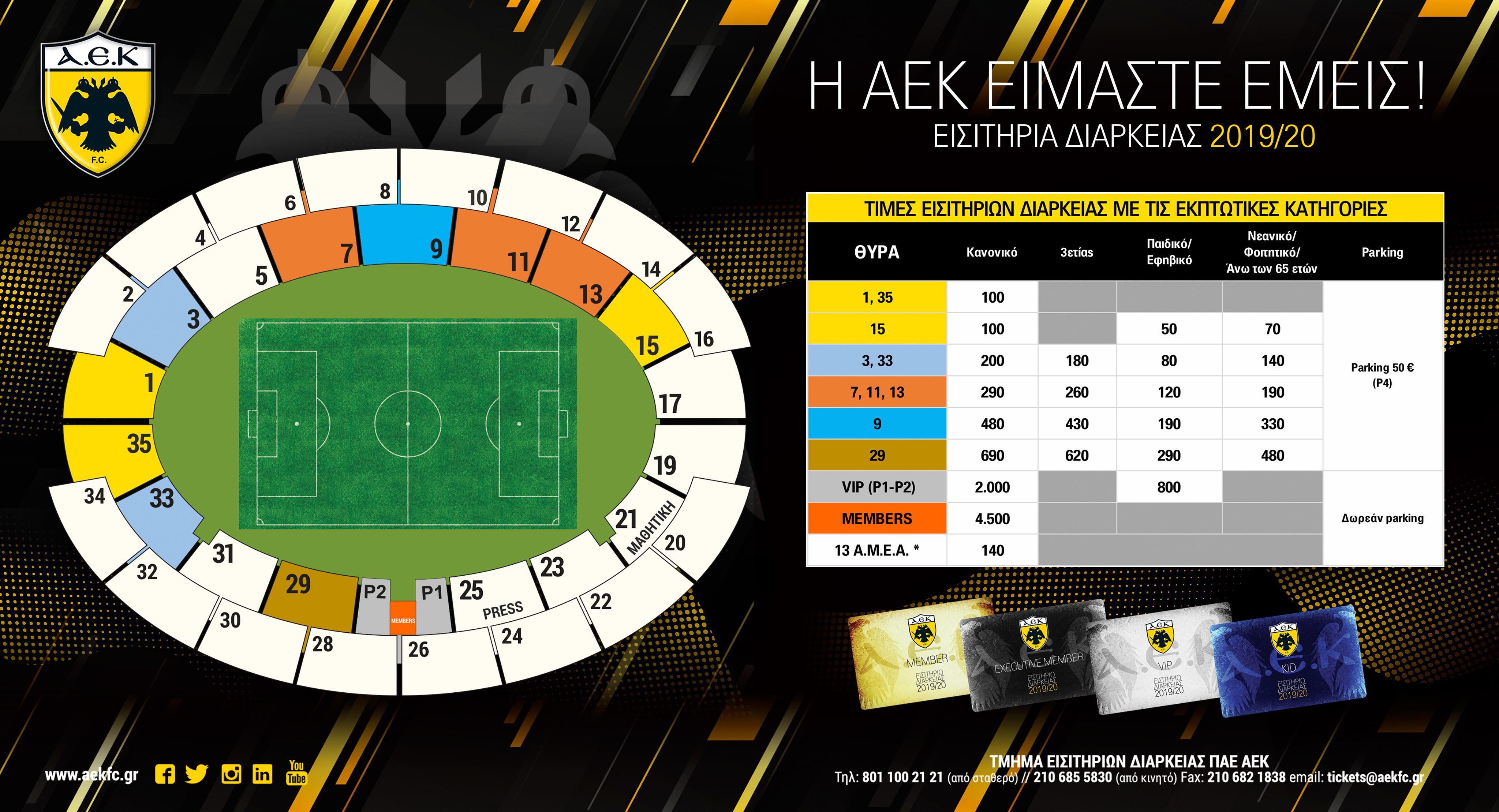 -Η ΠΑΕ ΑΕΚ διατηρεί στα ίδια επίπεδα τις περσινές εξορθολογισμένες τιμές, που παρέχουν στον κάτοχο του εισιτηρίου διαρκείας έκπτωση τουλάχιστον 20% και δυνατότητα έγκαιρης απόσβεσης του κόστους αγοράς σε σχέση με το απλό εισιτήριο. Και όλα αυτά μετά από ενδελεχή συγκριτική μελέτη με βάση τον περσινό κάτοχο διαρκείας σε σχέση με τον φίλαθλο που πήγε στους ίδιους αγώνες με απλό εισιτήριο.