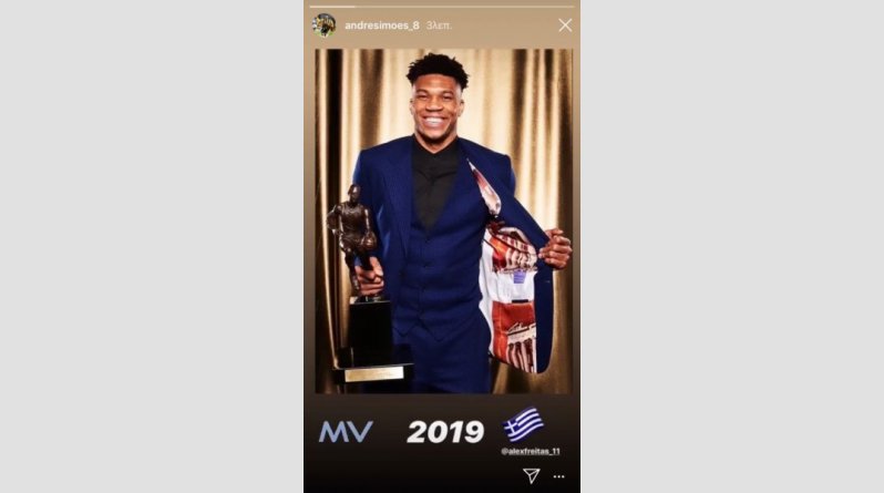 Ο Πορτογάλος χαφ της ΑΕΚ ανέβασε φωτογραφία του Έλληνα σταρ με το βραβείο του MVP και το περίφημο σακάκι με την Ακρόπολη, βάζοντας και την ελληνική σημαία.