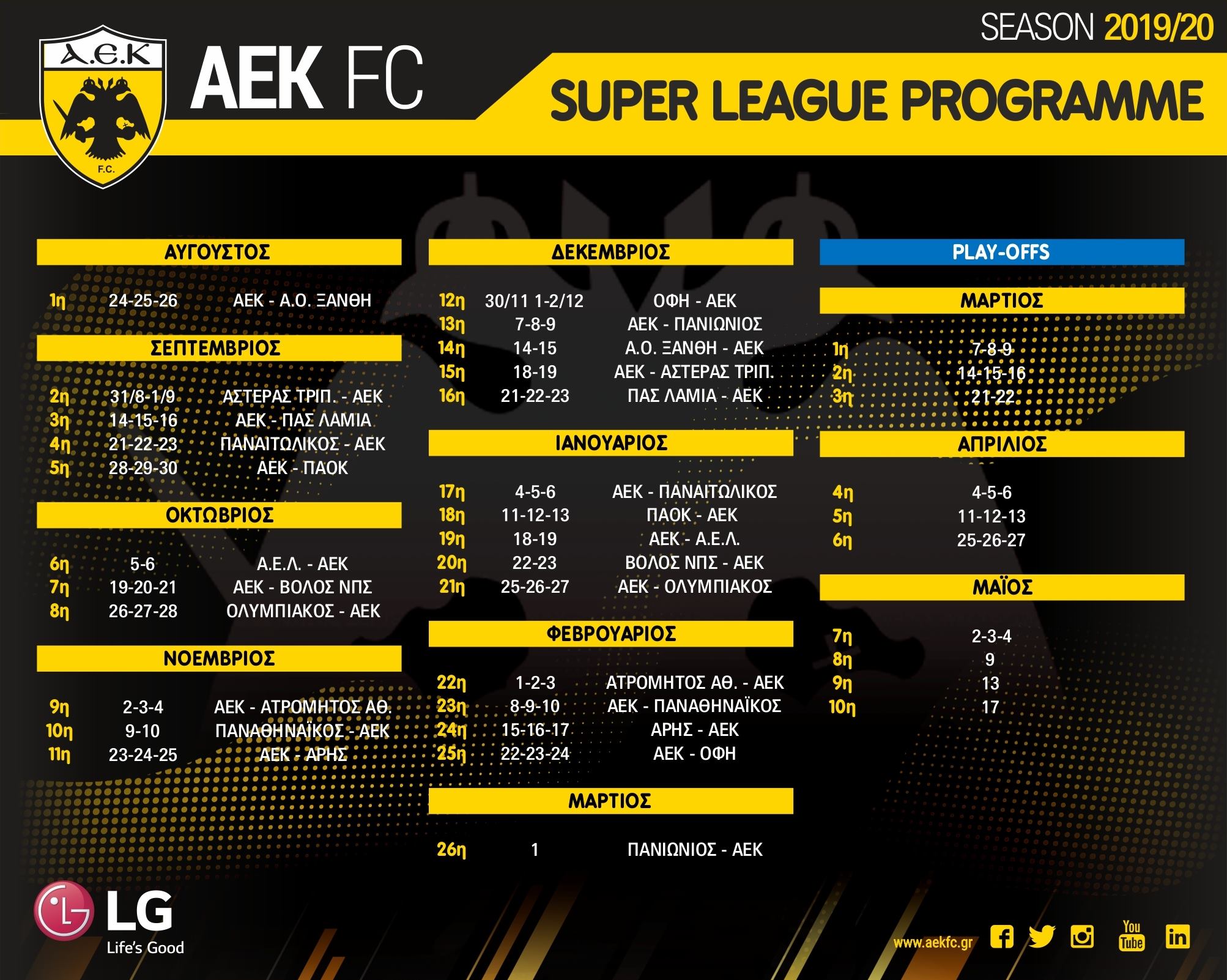 Έτσι, αναδείχθηκε πως οι κιτρινόμαυροι θα κάνουν πρεμιέρα στη νέα σεζόν κόντρα στην Ξάνθη, στις 24-16 Αυγούστου μέσα στο Ολυμπιακό Στάδιο. Το πρώτο ντέρμπι της σεζόν για την ΑΕΚ κληρώθηκε την 5η αγωνιστική το ΟΑΚΑ, κόντρα στον ΠΑΟΚ , ενώ στο «Γ. Καραϊσκάκης» πάει την 8η.