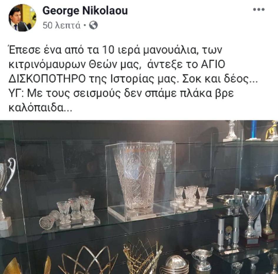 Ο ισχυρός σεισμός στην Αττική είχε ως αποτέλεσμα να κινδυνεύσουν τα τρόπαια της Βασίλισσας στα γραφεία της ομάδας, καθώς με δημοσίευση του ο Γιώργος Νικολάου, αναφέρει ότι έπεσε το ένα απ’ τα δέκα ιερά μανουάλια, ενώ προσθέτει ότι άντεξε το τρόπαιο του 1968!