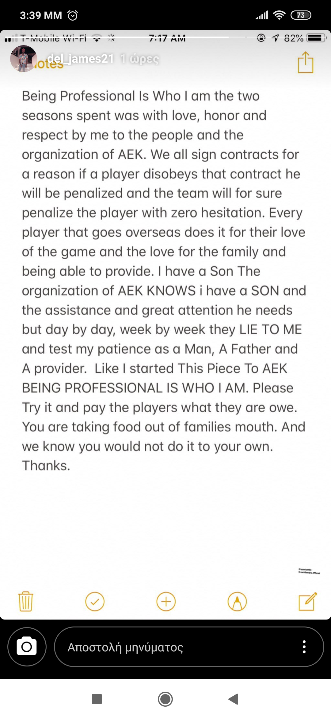 Μήνυμα-φωτιά από τον κιτρινόμαυρο παίκτης της ΚΑΕ ΑΕΚ που δηλώνει πως οι άνθρωποι της ομάδας δεν τον πληρώνουν, με τον ίδιο να έχει έναν γιο να προσέχει.