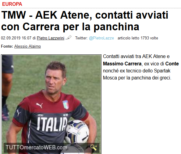 Σε αναζήτηση προπονητή βρίσκεται η ΑΕΚ το τελευταίο διάστημα και σημερινά (02/09) δημοσιεύματα από την Ιταλία βάζουν στο… κόλπο τον Μάσιμο Καρέρα.