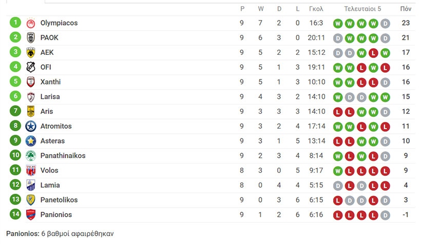 Δείτε πως διαμορφώνεται η βαθμολογία για την 9η αγωνιστική της Super League ΣΟΥΡΩΤΗ