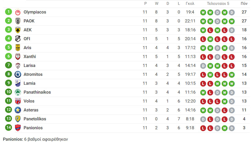 Δείτε πως διαμορφώνεται η βαθμολογία για την 11η αγωνιστική της Super League ΣΟΥΡΩΤΗ