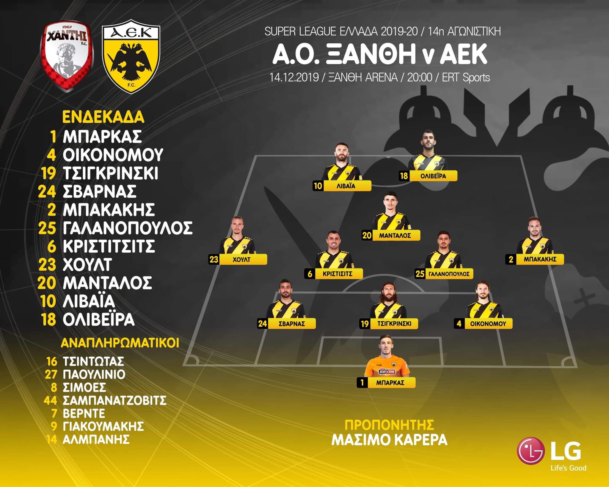 Συγκεκριμένα ο Μάσιμο Καρέρα έχει επιλέξει τον Μπάρκα να ξεκινήσει κάτω από τα δοκάρια της ΑΕΚ με τους Σβάρνα, Τσιγκρίνσκι και Οικονόμου στα στόπερ και τους Χουλτ, Κρίστιτσιτς, Γαλανόπουλο και Μπακάκη στη μεσαία γραμμή από τα αριστερά προς τα δεξιά αντίστοιχα. Μπροστά τους σε ρόλο δεκαριού θα αγωνιστεί ο Μάνταλος ενώ οι Λιβάγια και Ολιβέιρα θα βρίσκονται στην κορυφή της επίθεσης.