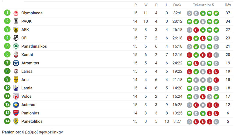 Δείτε πως διαμορφώνεται η βαθμολογία για την 15η αγωνιστική της Super League ΣΟΥΡΩΤΗ
