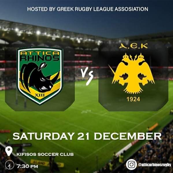 Τους Attica Rhinos αντιμετωπίζει αύριο (21/12, 19:30) η ομάδα Rugby League της ΑΕΚ. Ο αγώνας γίνεται στο πλαίσιο του Κυπέλλου Αθηνών, που είναι φιλική διοργάνωση προετοιμασίας.
