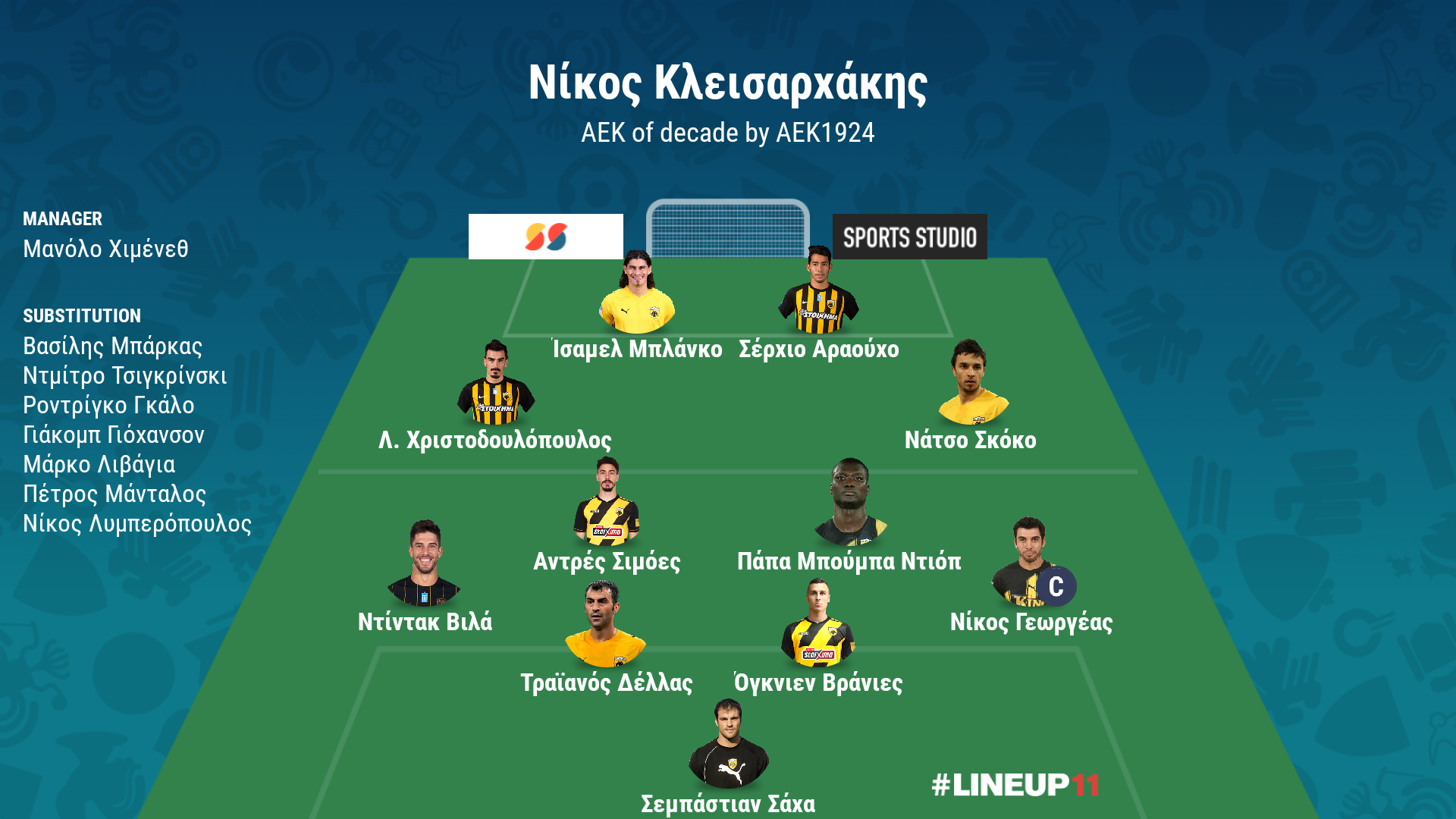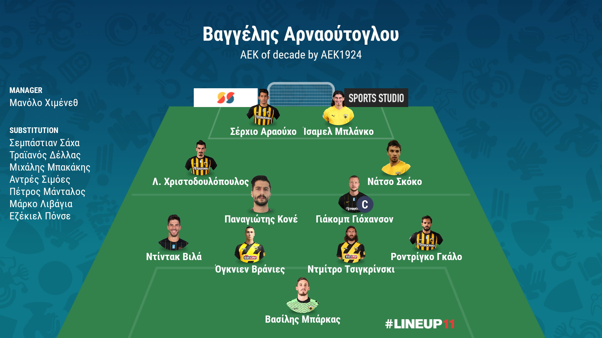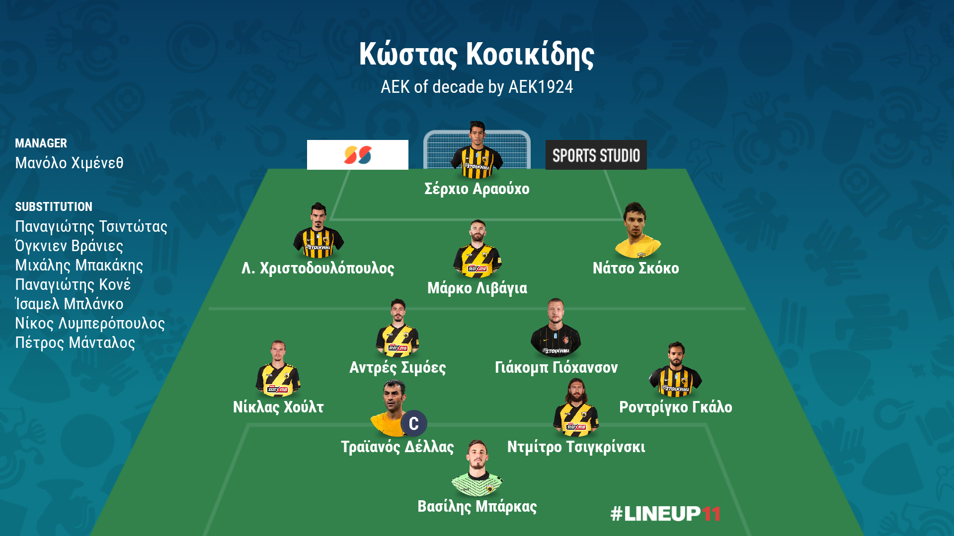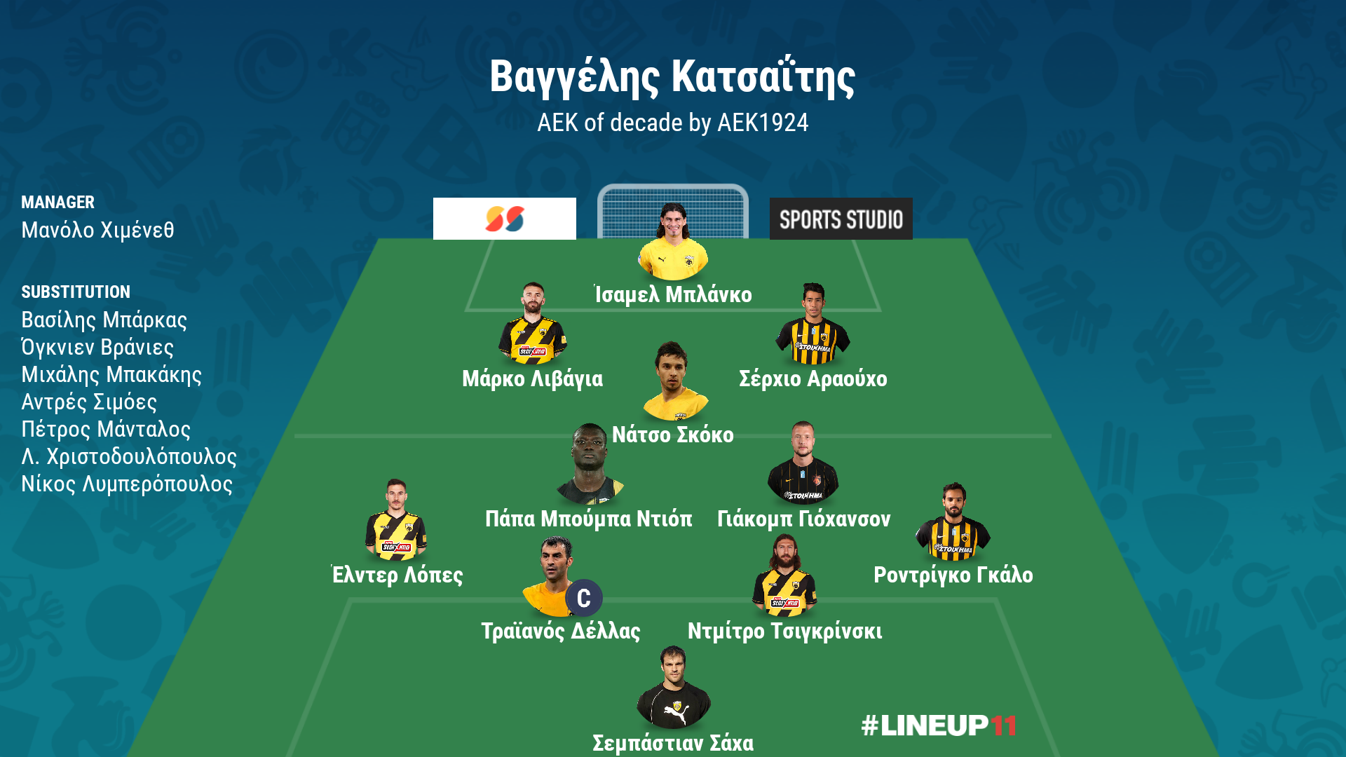 4-4-2 (4-2-4), Μανόλο Χιμένεθ, «Φυσικά δεν θα μπορούσε να βρεθεί άλλος πέρα από τον Ισπανό στον κιτρινόμαυρο πάγκο για την καλύτερη ΑΕΚ της δεκαετίας, καθώς αποτελεί εκείνον που οδήγησε ξανά στους τίτλους την ομάδα.»