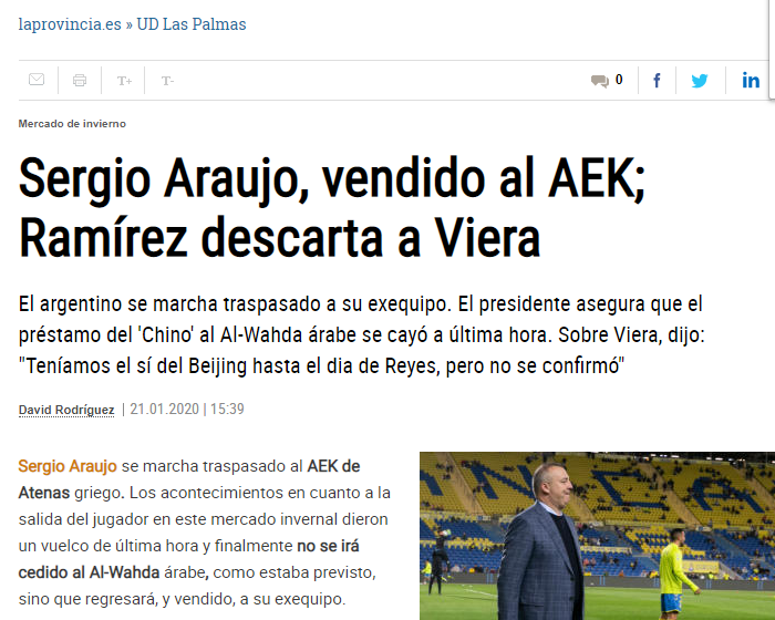 Συνεχίζοντας τα όσα ανέφερε ο διοικητικός ηγέτης της Λας Πάλμας, η «La Provincia» αποκαλύπτει πως: «ο Αραούχο θα μεταφερθεί στην Αθήνα τις επόμενες ημέρες για να υπογράψει ξανά στην ΑΕΚ.»