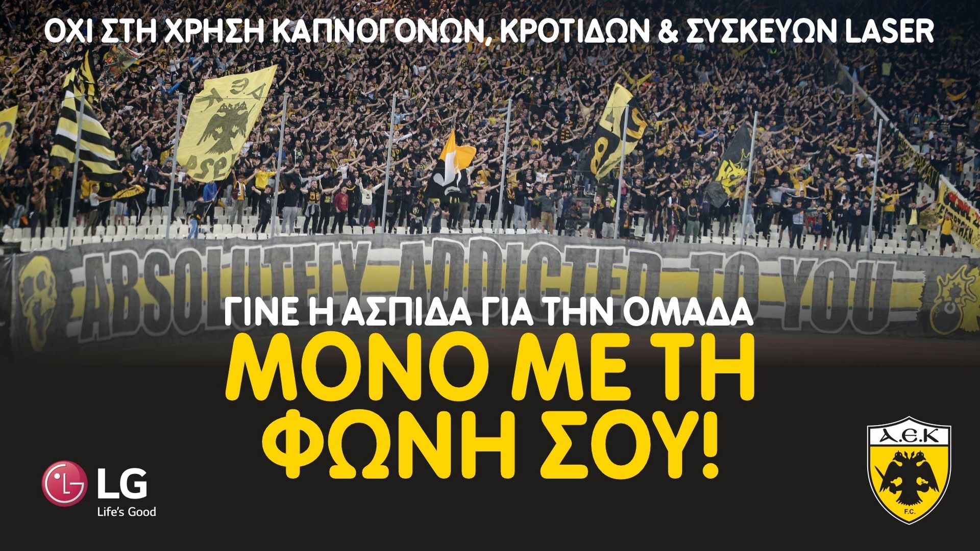 Με σύνθημα «Γίνε η ασπίδα για την ομάδα, μόνο με τη φωνή σου!», οι Κιτρινόμαυροι θέλουν να διασφαλίσουν την ομαλή διεξαγωγή της αναμέτρησης και ο κόσμος να σπρώξει την ΑΕΚ μόνο με τον παλμό και τη φωνή του.