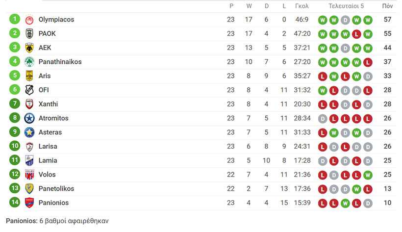 Δείτε πως διαμορφώνεται η βαθμολογία για την 23η αγωνιστική της Super League ΣΟΥΡΩΤΗ
