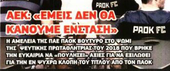 Δείτε τι γράφει σήμερα η εφημερίδα metrosport για την απόφαση της ΑΕΚ να μην κάνει ένσταση. Συγκεκριμένα αναφέρει στο πρωτοσέλιδο της: «Η αμέλεια της ΠΑΕ ΠΑΟΚ βούτυρο στο ψωμί της ψεύτικης πρωταθλήτριας του 2018 που βρήκε την ευκαιρία να πουλήσει αξίες για να εξιλεωθεί για την εν ψυχρώ κλοπή του τίτλου από τον ΠΑΟΚ». Μάλιστα η εφημερίδα αναφέρει επίσης: «Ο κόσμος του ΠΑΟΚ δεν ανέχεται χατιράκια από την ΑΕΚ».
