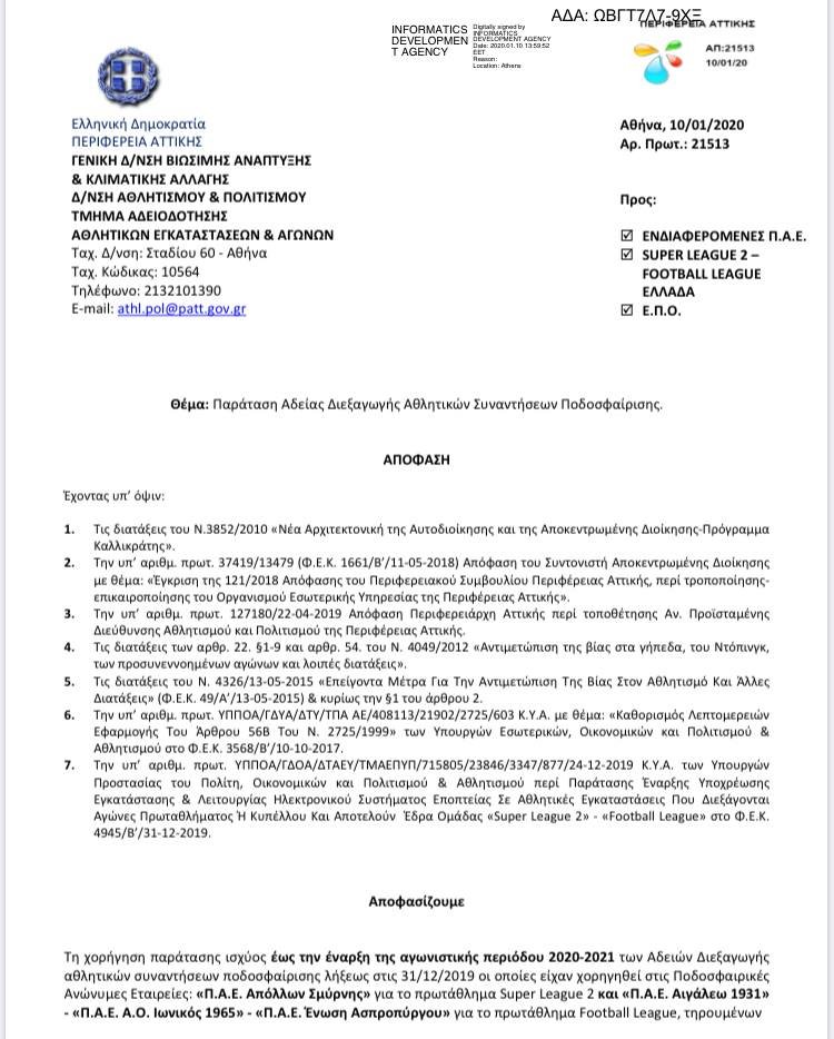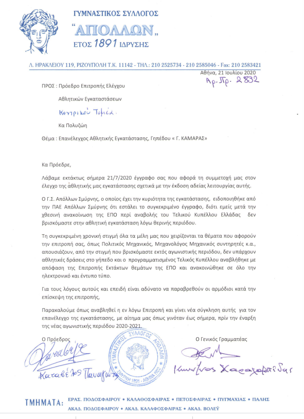 Το γεγονός αυτό, που αποδεικνύεται από το έγγραφο του Γ.Σ. ΑΠΟΛΛΩΝ που επισυνάπτεται, καθώς και η πρόταση από πλευράς του Συλλόγου να γίνει η διαδικασία επανελέγχου πριν την έναρξη της νέας αγωνιστικής, κάτι που θα συμβεί ούτως ή άλλως αφού η άδεια που έχει χορηγηθεί από την Αποκεντρωμένη Διοίκηση λήγει στις 31/8, δημιουργεί εύλογα ερωτήματα.