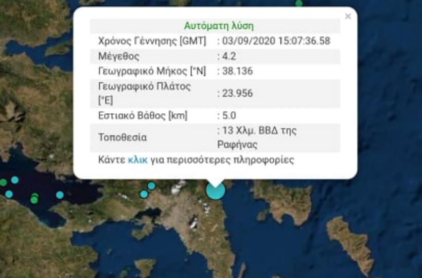 Το επίκεντρο του σεισμού εντοπίζεται 17 χιλιόμετρα βόρεια της Ραφήνας, ενώ το εστιακό βάθος υπολογίζεται στα 6,8 χλμ.