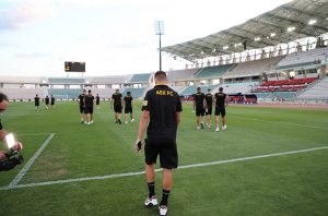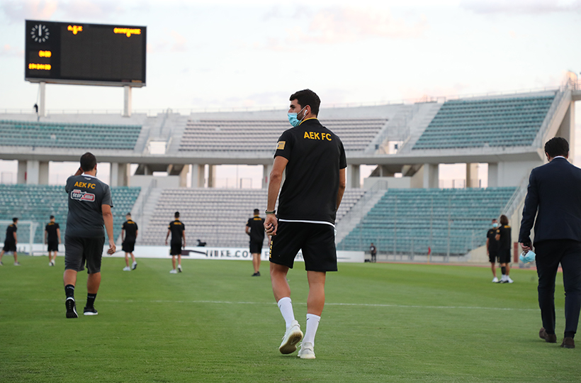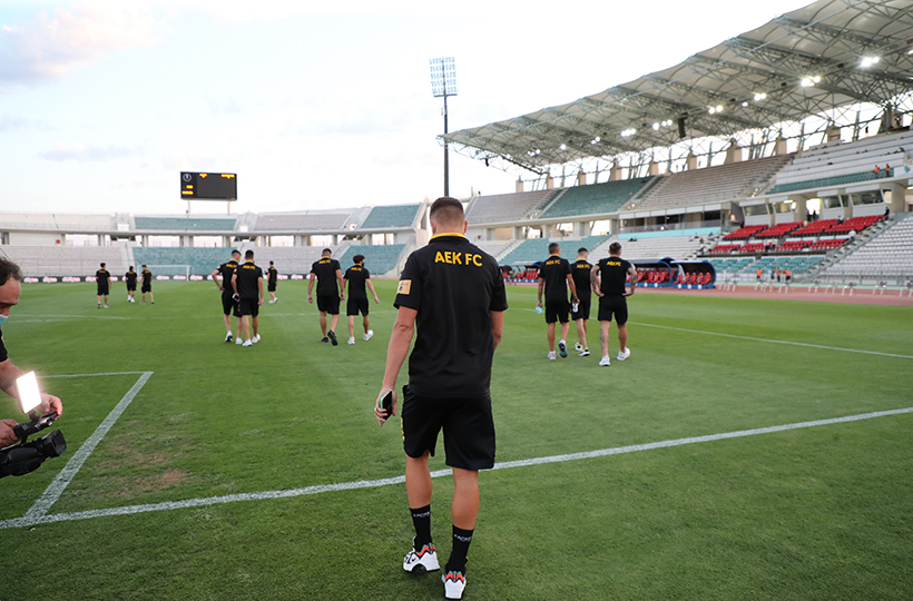 Στο Πανθεσσαλικό βρίσκεται η αποστολή της ΑΕΚ, με τους ανθρώπους της ομάδας και τους ποδοσφαιριστές να βγαίνουν για την αναγνωριστική βόλτα στον αγωνιστικό χώρο του γηπέδου.