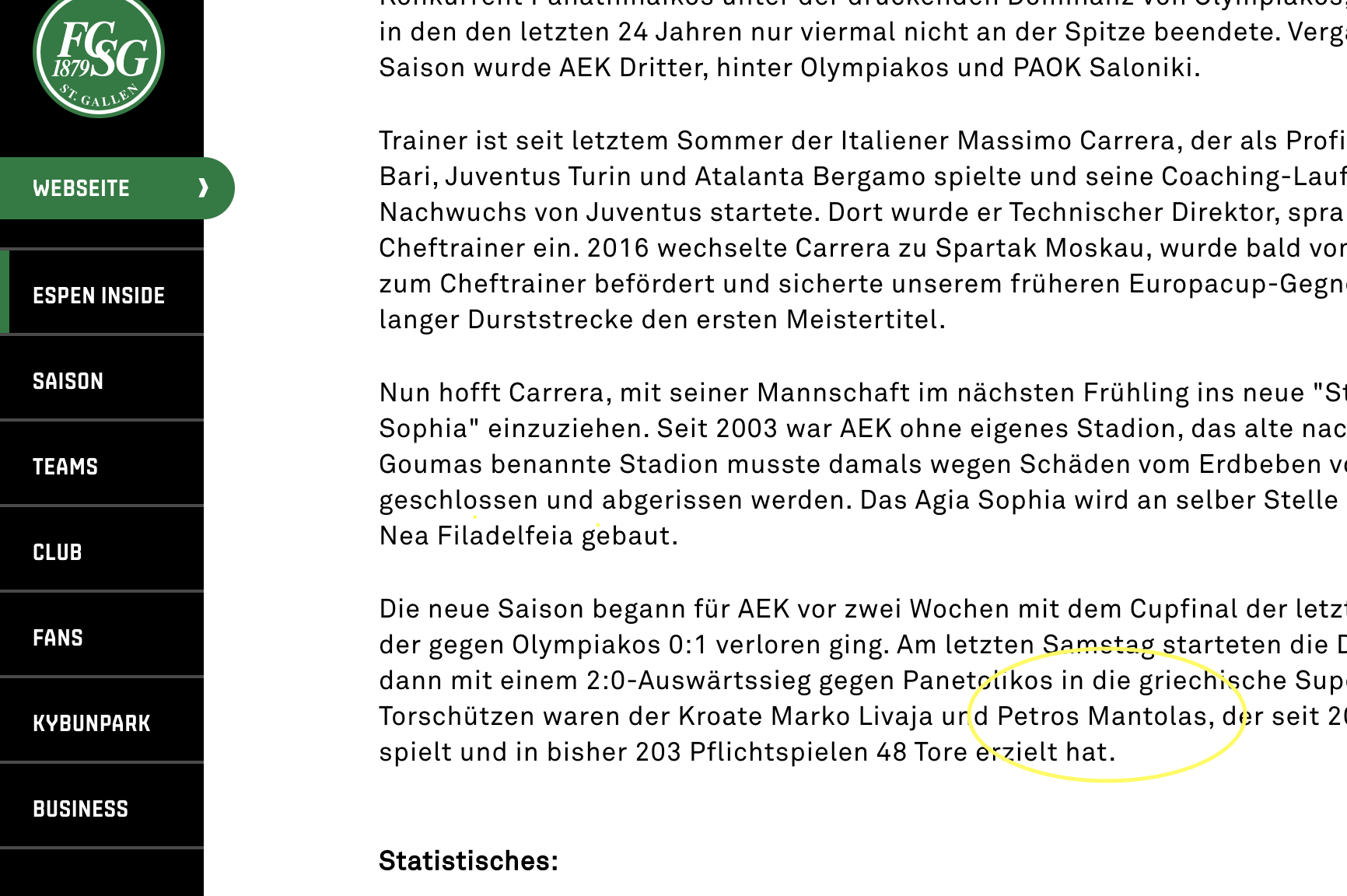 Μέσω της επίσημης ιστοσελίδας της η Ζανκτ Γκάλεν, έκανε μία ξεχωριστή παρουσίαση για την ΑΕΚ και το ματς της Πέμπτης (24/09, 21:30 -CosmoteTV), μπερδεύοντας όμως το όνομα του αρχηγού της Ενωσης, Πέτρου Μάνταλου.