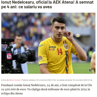 «Ο Ρουμάνος αμυντικός, Ιονούτ Νεντελτσεάρου (24 ετών), αγοράστηκε από την Ούφα για 400.00€. Θα κερδίσει 2.000.000€ έως το 2024 στην ομάδα της Αθήνας. Ακόμα ένας Ρουμάνος διεθνής αλλάζει ομάδα αυτή την μεταγραφική περίοδο.