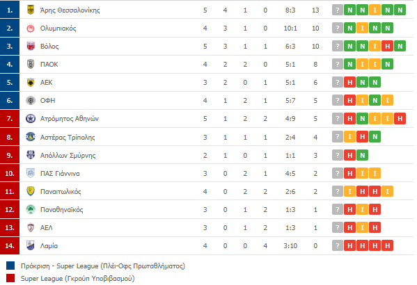 Δείτε πώς έχει διαμορφωθεί η βαθμολογία μετά τα τρία πρώτα ματς της 5ης αγωνιστικής της Super League Interwetten και τις νίκες των Ολυμπιακού, Άρη και Βόλου.