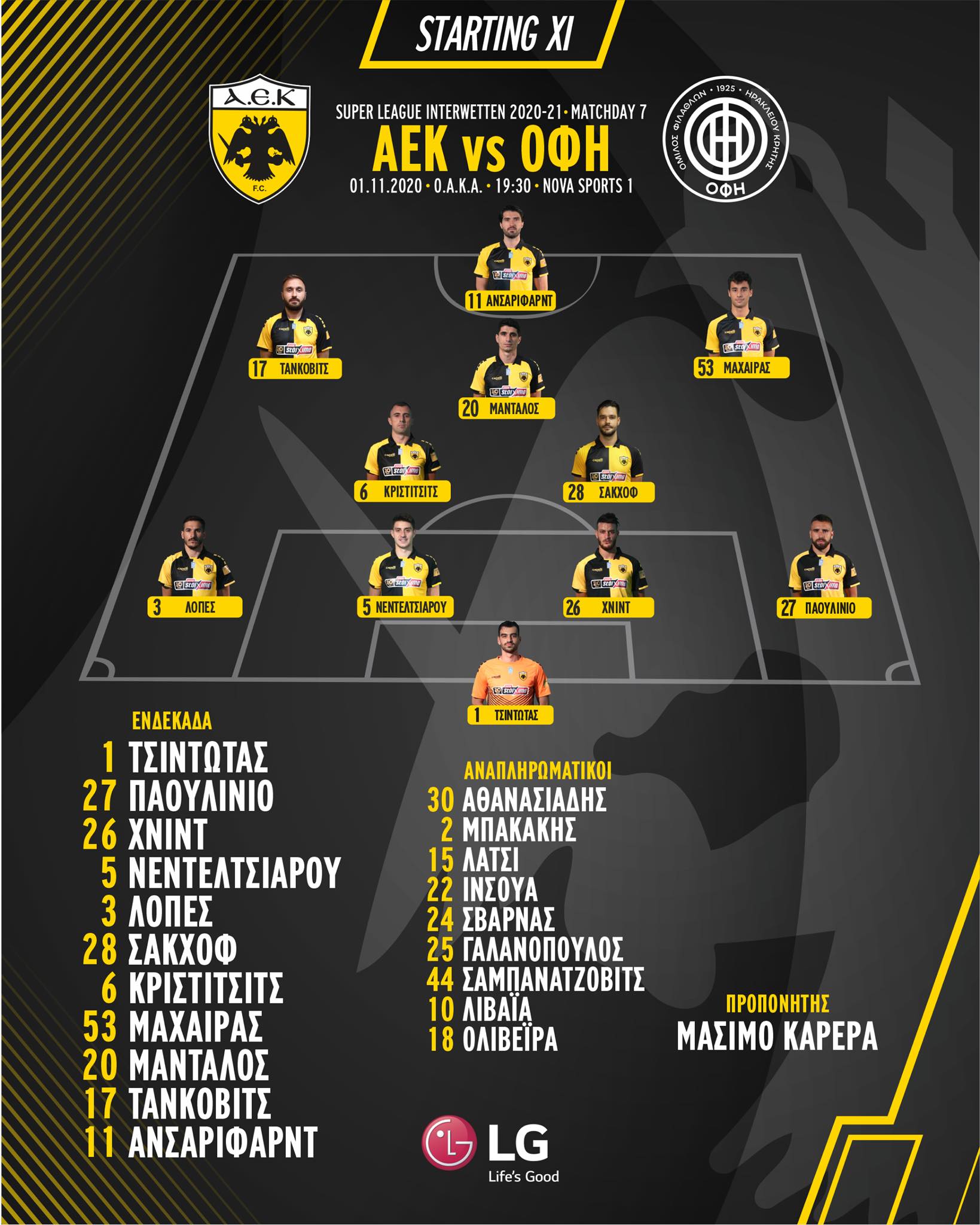Ο Μάσιμο Καρέρα έχει καταλάβει την ιδιαιτερότητα του αγώνα με τον ΟΦΗ και επέλεξε τα… βασικά του όπλα για να ξεκινήσουν την αναμέτρηση στο ΟΑΚΑ