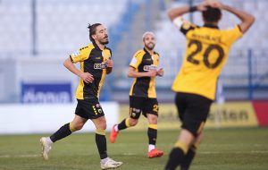 Ο Πορτογάλος μέσος της ΑΕΚ όπλισε και πυροβόλησε ξανά με το δεξί τον αντίπαλο, όπως έπραξε και με την Βόλφμπουργκ, προσπαθώντας να φιλήσει το… όπλο του.