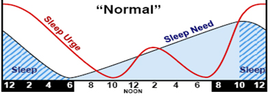 Εικόνα 2: Φυσιολογικός κιρκάδιος ρυθμός του ύπνου . Η  έντονη επιθυμία (sleep urge) για ύπνο είναι μεγαλύτερη τη νύχτα με μια μικρή αύξηση στα μέσα της ημέρας. Η ανάγκη(sleep need ) για ύπνο αυξάνεται καθ ‘όλη τη διάρκεια την ημέρας  και αναπληρώνεται κατά την διάρκεια που κοιμόμαστε .