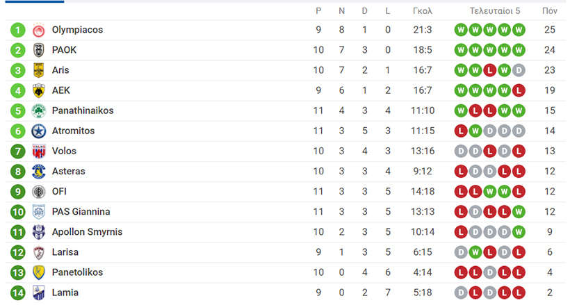 Δείτε πως διαμορφώνεται η βαθμολογία για την 11η αγωνιστική της Super League Interwetten.
