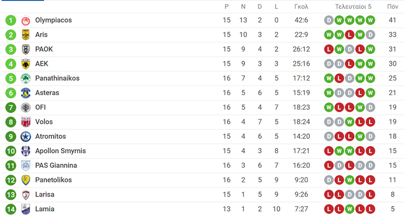 Δείτε πως διαμορφώνεται η βαθμολογία για την 16η αγωνιστική της Super League ΣΟΥΡΩΤΗ