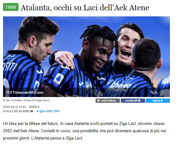 «Η Αταλάντα βλέπει τον Λάτσι από την ΑΕΚ. Μία ιδέα για την άμυνα του μέλλοντος. Στην Αταλάντα έχουν στραφεί στον Λάτσι, ο οποίος γεννήθηκε το 2002 και ανήκει στην ΑΕΚ. Η Αταλάντα σκέφτεται τον Λάτσι και ίσως γίνει κάτι τις επόμενες ημέρες».