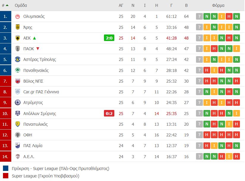 Από πίσω ο ΠΑΟΚ με 1 βαθμό διαφορά και ο Αστέρας Τρίπολης με τον Παναθηναϊκό με 6 ακολουθούν στην βαθμολογία.