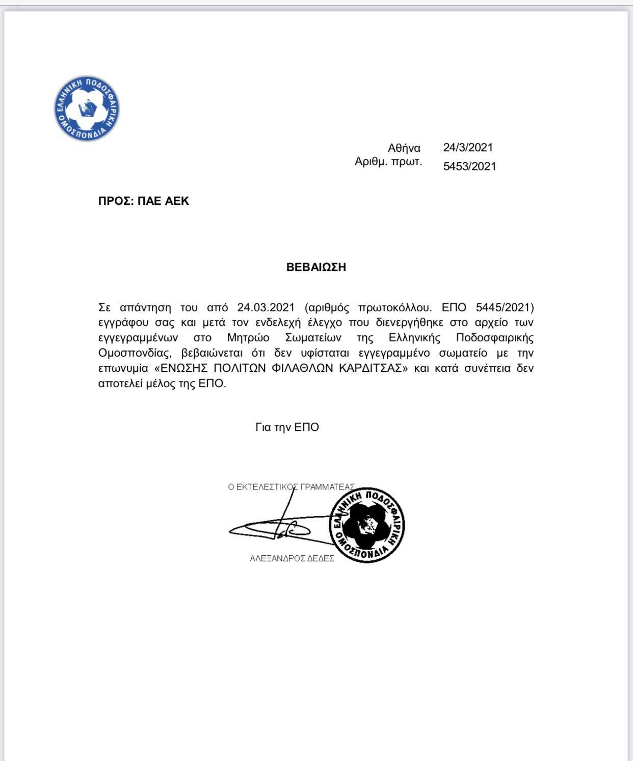 «Δεν υφίσταται εγγεγραμμένο σωματείο με την επωνυμία ‘’Ένωσης Πολιτών Φιλάθλων Καρδίτσας’’ και κατά συνέπεια δεν αποτελεί μέλος της ΕΠΟ», αναφέρει η απάντηση της Ομοσπονδίας.