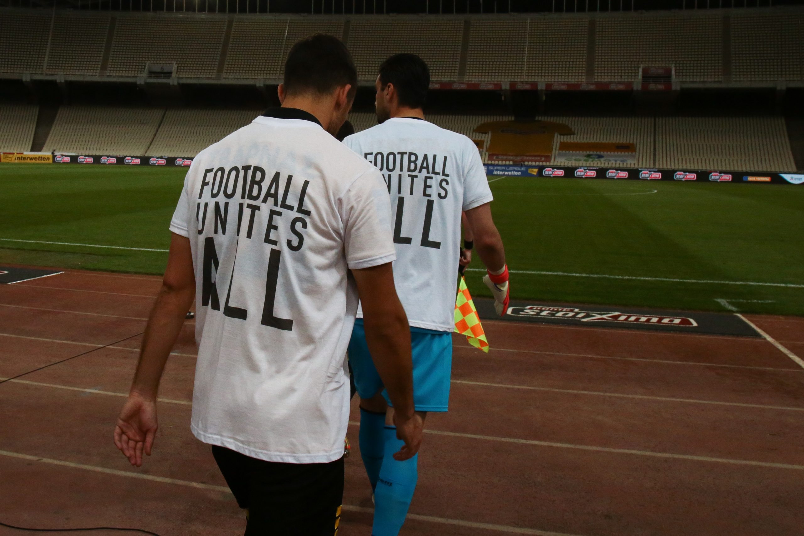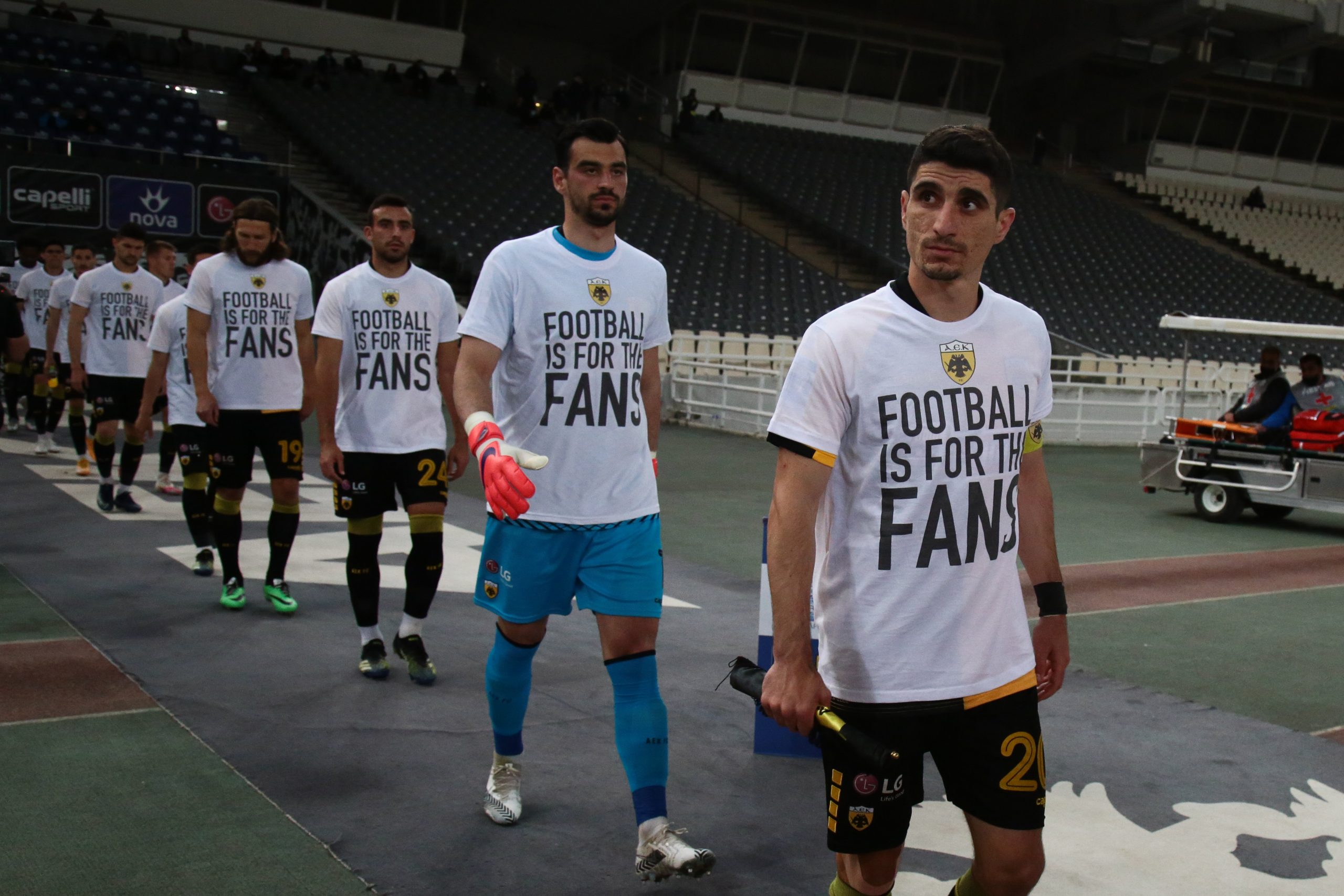 Οι ποδοσφαιριστές της ΑΕΚ βγήκαν στον αγωνιστικό χώρο για το ντέρμπι με τον Παναθηναϊκό φορώντας μπλουζάκια στα οποία αναγραφόταν το μήνυμα «Football is for the fans».