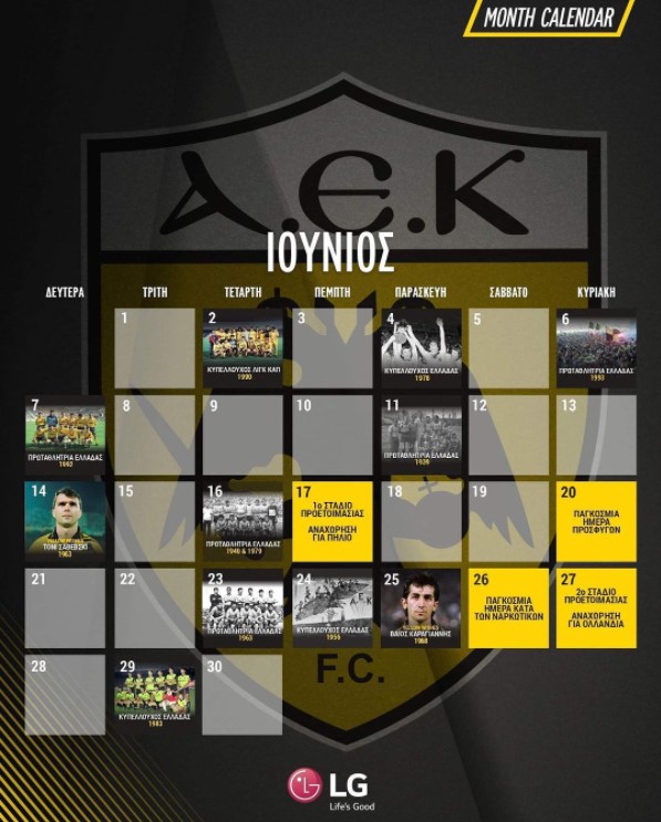 Η ΠΑΕ ΑΕΚ δημοσίευσε στα social media το ημερολόγιο με τις σημαντικές ημερομηνίες της, για το μήνα Ιούνιο, με σημαδεμένη την ημερομηνία στις 17 Ιουνίου που αναχωρεί η ομάδα για Πήλιο και 27 για Ολλανδία.