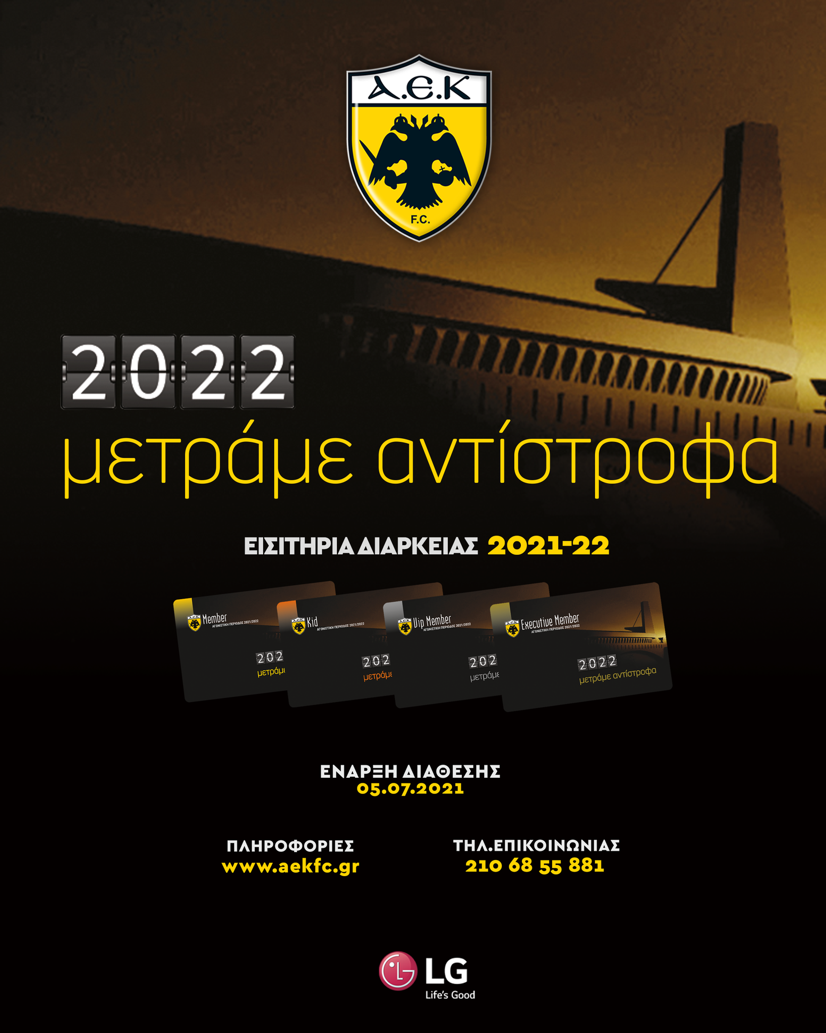 Η ΠΑΕ ΑΕΚ ανακοινώνει ότι η διάθεση των εισιτηρίων διαρκείας για τη νέα σεζόν θα αρχίσει τη Δευτέρα 5 Ιουλίου στο Ολυμπιακό Στάδιο και -σε πλήρη εναρμόνιση με τις κυβερνητικές αποφάσεις- θα απαιτείται για την έκδοση του εισιτηρίου η προσκόμιση του ψηφιακού πιστοποιητικού COVID-19, που θα βεβαιώνει ότι ο κάτοχος είναι πλήρως εμβολιασμένος ή έχει νοσήσει τους προηγούμενους έξι μήνες.