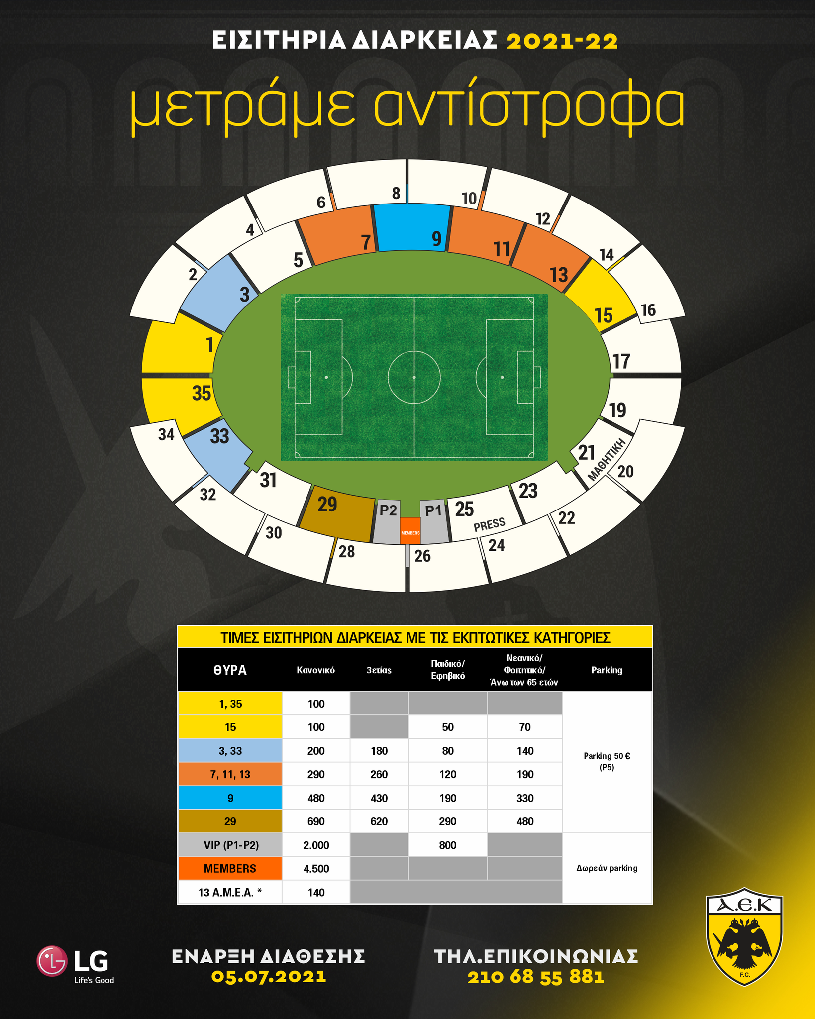 Το τμήμα εισιτηρίων διαρκείας της ΠΑΕ ΑΕΚ θα λειτουργεί και φέτος στο ΟΑΚΑ, κάτω από τη Θύρα των επισήμων. Η είσοδος θα γίνεται από την Πύλη A του ΟΑΚΑ, η στάθμευση στο Parking P2 και λόγω των έργων στο Ολυμπιακό Στάδιο θα υπάρχει ειδική σήμανση για τη διαδρομή που θα ακολουθείται για λόγους ασφαλείας μέσω του P2.