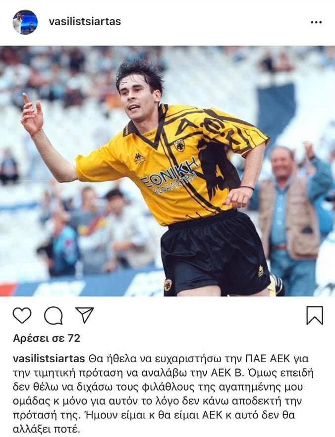 Ο Βασίλης Τσιάρτας με μια ανάρτηση του στα social media, γνωστοποίησε ότι δεν θέλει να διχάσει τον κόσμο της αγαπημένης του ομάδας και γι’ αυτό δεν θα κάνει δεκτή την πρόταση της, ενώ πρόσθεσε ότι ήταν, είναι και θα είναι ΑΕΚ, κάτι που δεν θα αλλάξει ποτέ.