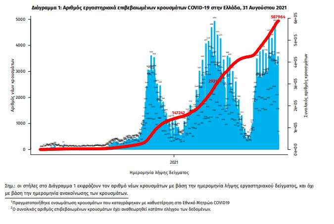 Τα νέα εργαστηριακά επιβεβαιωμένα κρούσματα της νόσου που καταγράφηκαν τις τελευταίες 24 ώρες είναι 3.628, εκ των οποίων 25 εντοπίστηκαν κατόπιν ελέγχων στις πύλες εισόδου της χώρας. Ο συνολικός αριθμός των κρουσμάτων ανέρχεται σε 587.964 (ημερήσια μεταβολή +0.7%), εκ των οποίων 51.1% άνδρες. 1 2 Με βάση τα επιβεβαιωμένα κρούσματα των τελευταίων 7 ημερών, 206 θεωρούνται σχετιζόμενα με ταξίδι από το εξωτερικό και 1.404 είναι σχετιζόμενα με ήδη γνωστό κρούσμα.