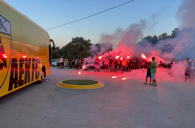 Ο κόσμος έστησε πάρτι με καπνογόνα, αποθέωσε τους Κιτρινόμαυρους και υποχρέωσε το πούλμαν να σταματήσει.