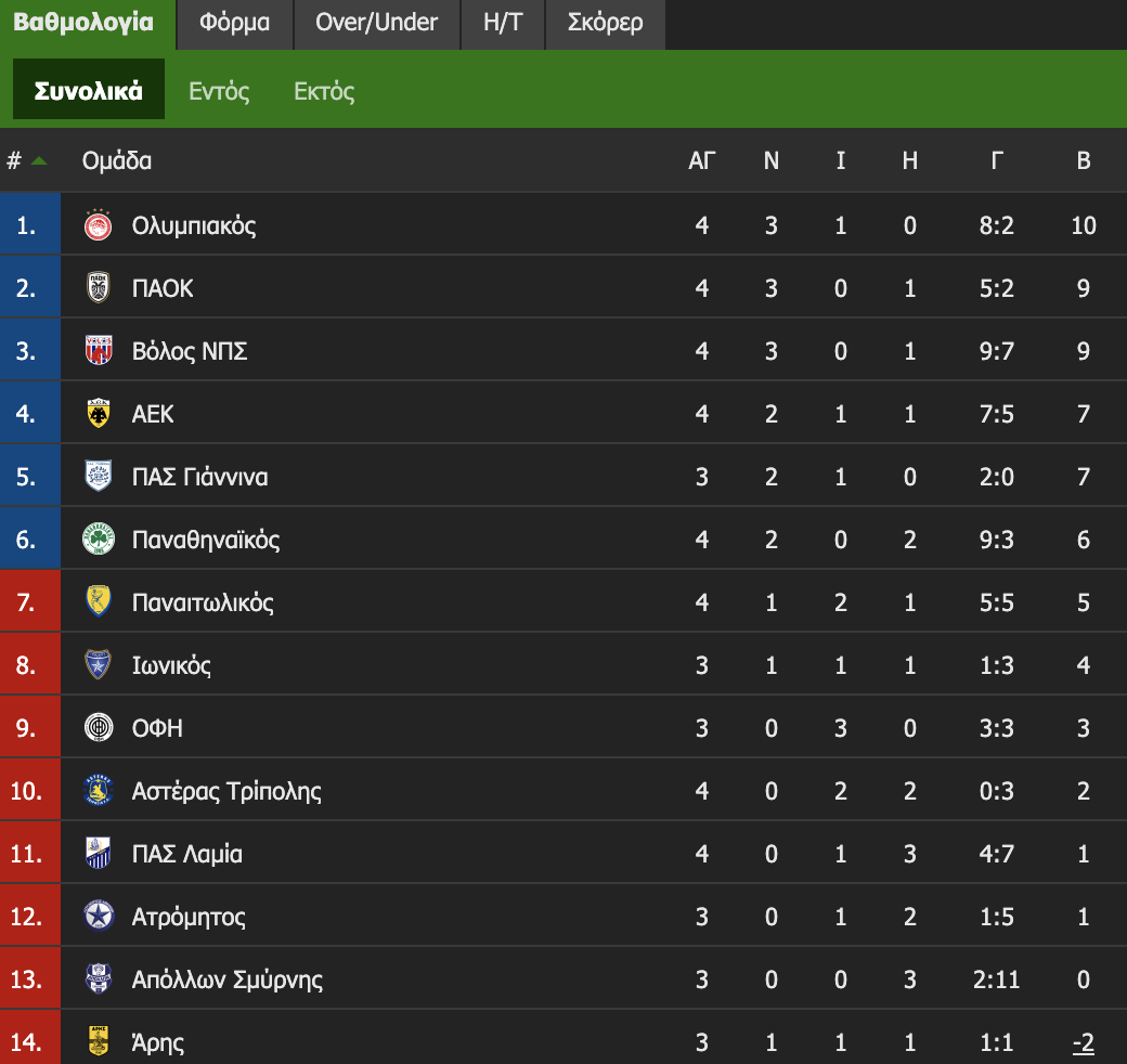 Μόνος στην κορυφή βρίσκεται ο Ολυμπιακός μετά τους αγώνες της 4ης αγωνιστικής, αφού οι ερυθρόλευκοι μετά την νίκη τους στην Τρίπολη επί του Αστέρα έφτασαν τους 10 βαθμούς.