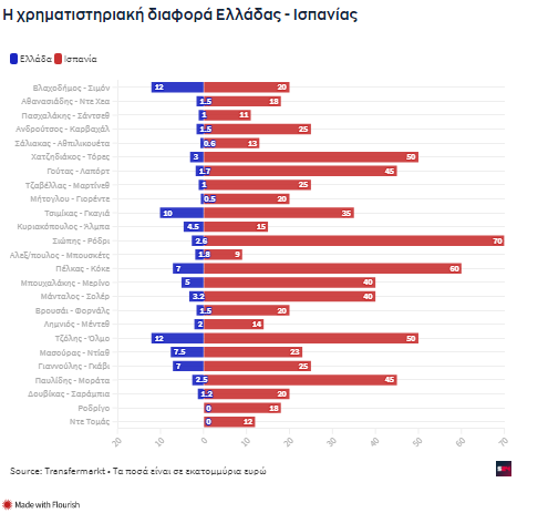 Αν κάνουμε μια απόπειρα να συγκρίνουμε τις αξίες κάθε παίκτη και τις τοποθετήσουμε στο ίδιο γράφημα, η διαφορά των δύο ομάδων αποτυπώνεται ακόμα πιο ξεκάθαρα. Δεν υπάρχει Έλληνας παίκτης που να αξίζει περισσότερο από Ισπανό στην ίδια θέση. Μάλιστα, οι διαφορές σε όλες τις περιπτώσεις είναι διψήφιες, με εξαίρεση τη θέση του τερματοφύλακα, όπου ο Βλαχοδήμος απέχει “μόλις” 8.000.000 από τον Ουνάι Σιμόν.