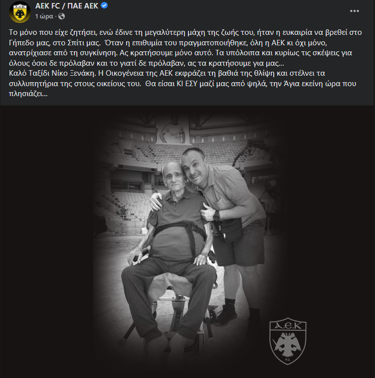 Το μόνο που είχε ζητήσει, ενώ έδινε τη μεγαλύτερη μάχη της ζωής του, ήταν η ευκαιρία να βρεθεί στο Γήπεδο μας, στο Σπίτι μας. Όταν η επιθυμία του πραγματοποιήθηκε, όλη η ΑΕΚ κι όχι μόνο, ανατρίχιασε από τη συγκίνηση. Ας κρατήσουμε μόνο αυτό. Τα υπόλοιπα και κυρίως τις σκέψεις για όλους όσοι δε πρόλαβαν και το γιατί δε πρόλαβαν, ας τα κρατήσουμε για μας…