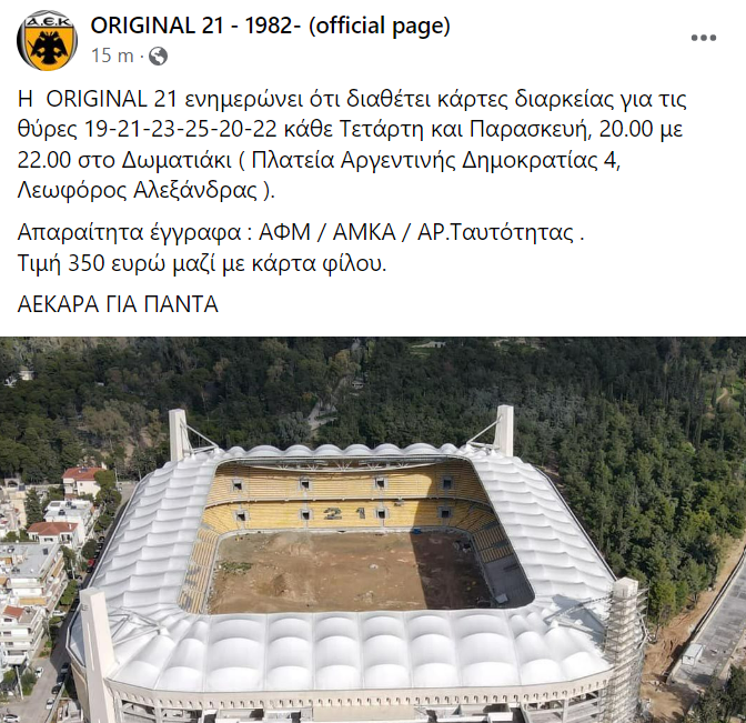 Συγκεκριμένα η ORIGINAL 21 ανακοίνωσε ότι διαθέτει κάρτες διαρκείας για τις θύρες 19-21-23-25-20-22 κάθε Τετάρτη και Παρασκευή, 20.00 με 22.00 στο Δωματιάκι (Πλατεία Αργεντινής Δημοκρατίας 4, Λεωφόρος Αλεξάνδρας).