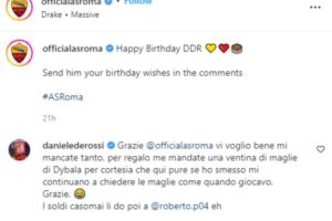 “Σε ευχαριστώ Ρόμα, σε αγαπώ και μου λείπεις τόσο πολύ, σαν δώρο μου στέλνεις 20 μπλούζες Ντιμπάλα σε παρακαλώ; Ακόμα κι αν σταμάτησα μου ζητούν ακόμα μπλούζες όπως όταν έπαιζα”.