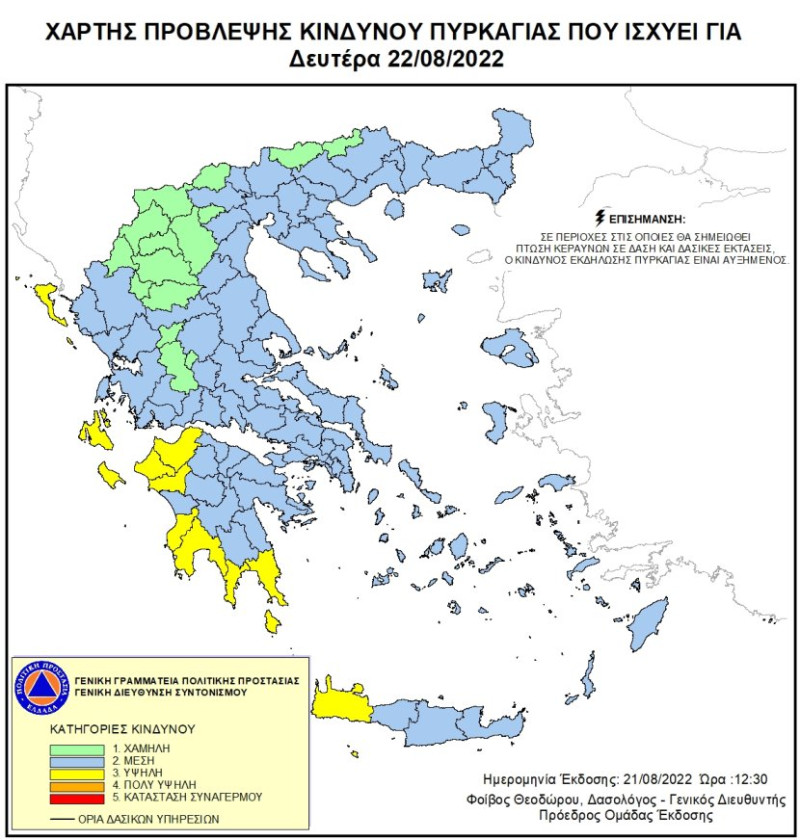 Ο χάρτης Πρόβλεψης Κινδύνου Πυρκαγιάς για σήμερα, Δευτέρα 22/8