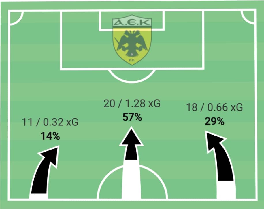 Η ΑΕΚ έπαιξε σε ακόμη ένα παιχνίδι με υπομονή και αυτό φαίνεται από το γράφημα με τις μεγάλες μπαλιές. Το ποσοστό της σε μεγάλες μπάλες έφτασε μόλις στο 8% όπως βλέπουμε και πιο κάτω. Αυτό μας δείχνει ότι ακόμη και όταν δεν ήρθε ένα γρήγορο γκολ στο πρώτο ημίχρονο, δεν χάλασε το παιχνίδι της αλλά συνέχισε με υπομονή να παίζει με την μπάλα κάτω.