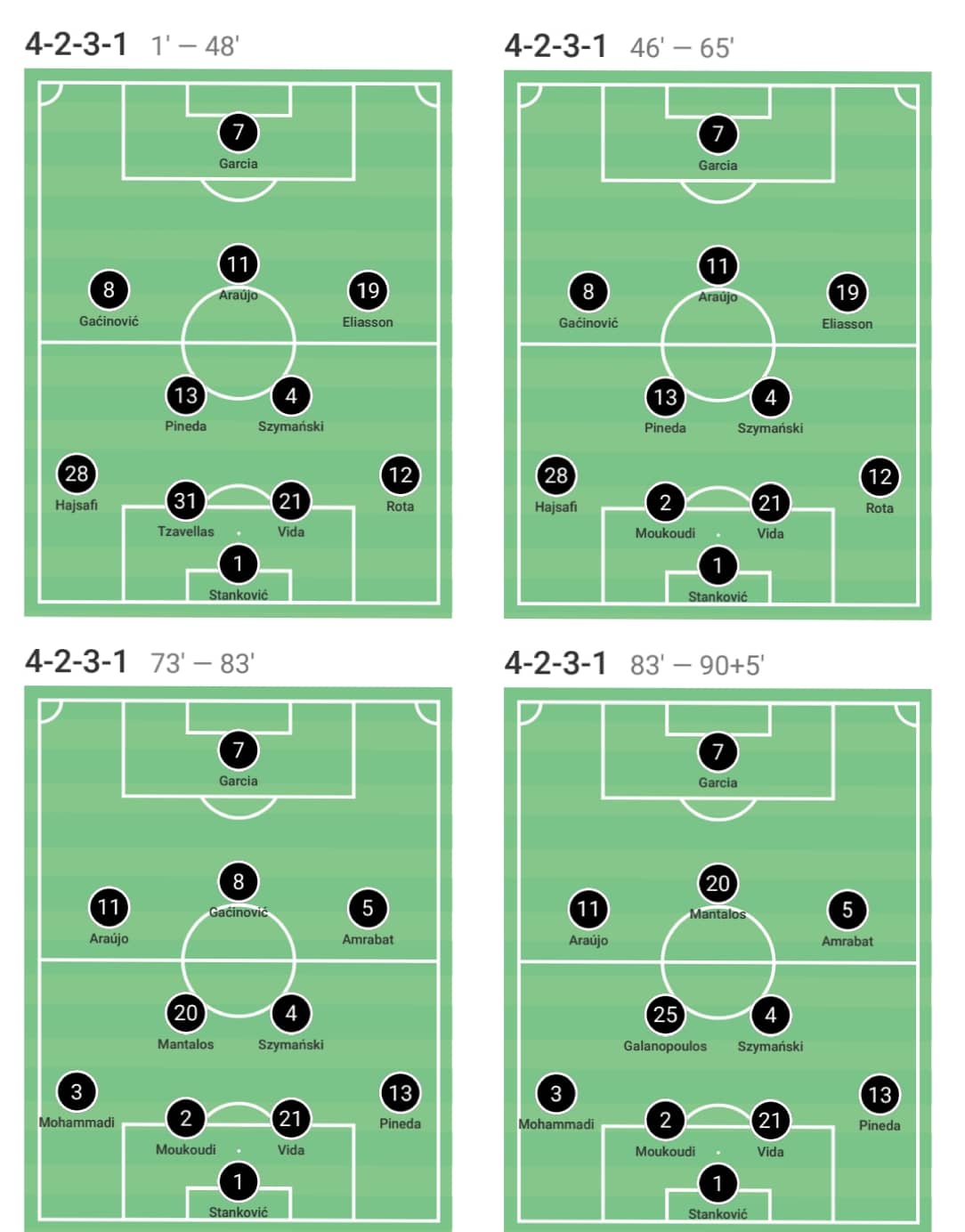 Στην ανάλυση του παιχνιδιού, ο Ματίας Αλμέιδα ξεκίνησε και τελείωσε τον αγώνα με σχηματισμό 4-2-3-1, το οποίο ωστόσο ήταν μόνο στην θεωρία ή καλύτερα στο πινακάκι της τακτικής.
