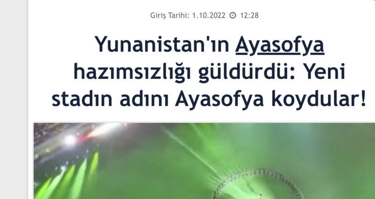 ”Πόνεσαν” οι Τούρκοι με τις χθεσινές εικόνες στην ”Αγιά Σοφιά”! Τι αναφέρουν: ”Η απληστία της Ελλάδας, που ενόχλησε πολύ το γεγονός ότι η Αγία Σοφία επαναλειτούργησε ως τζαμί μας έκανε να γελάσουμε. Οι Έλληνες που ονόμασαν το νέο γήπεδο «Αγία Σοφία» που κατασκευάστηκε για τον ποδοσφαιρικό σύλλογο ΑΕΚ της πρωτεύουσας Αθηνών, έκαναν τα εγκαίνια με χόρον και κεμεντσέ.