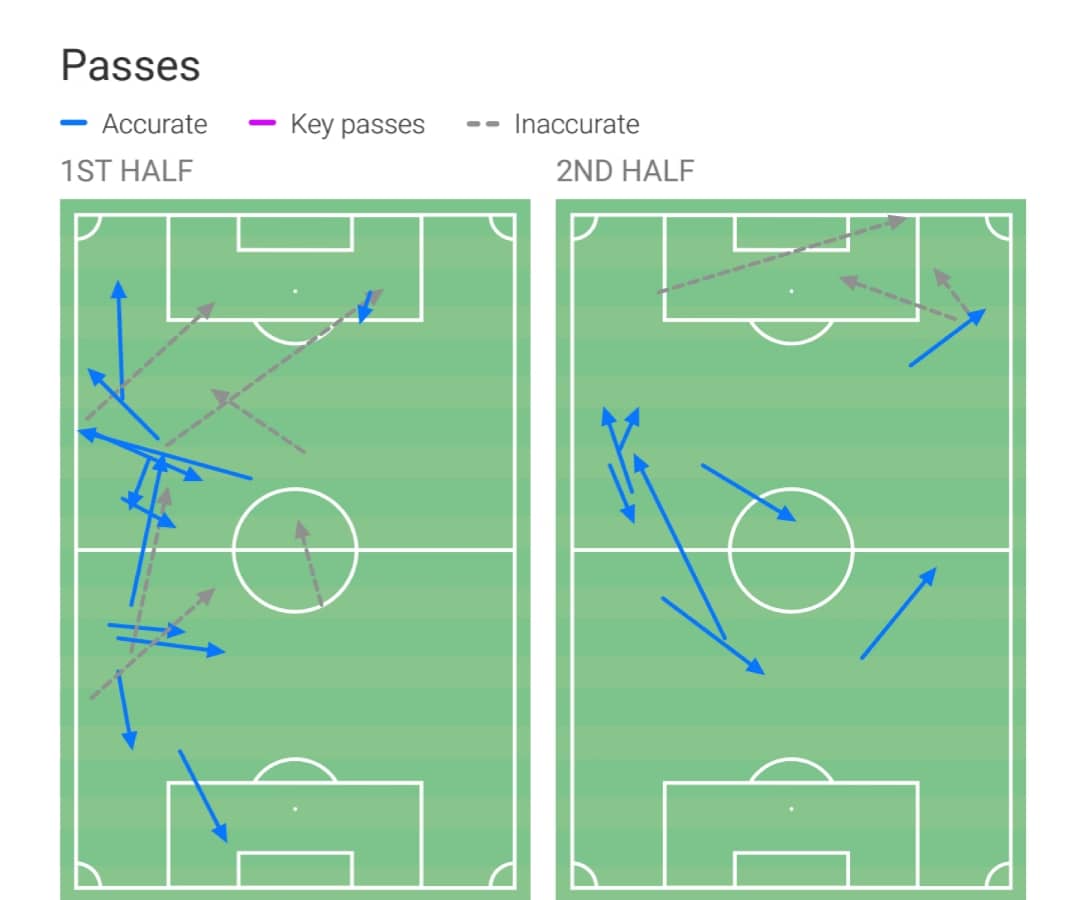 Γκολ δεν έβαλε, ίσα ίσα έχασε ένα που δεν χάνεται, αλλά έκανε πολλά άλλα πράγματα στον αγωνιστικό χώρο. Χαμήλωνε στο γήπεδο έπαιρνε την μπάλα και προσπαθούσε να δημιουργήσει παιχνίδι. Πιστώνεται την ασίστ στον Γκαρσία που έγινε γκολ, είχε 72% ακρίβεια στις πάσες, 6 ανακτήσεις μπάλας στο επιθετικό τρίτο, και 4/4 επιτυχημένες πάσες προς το επιθετικό τρίτο.