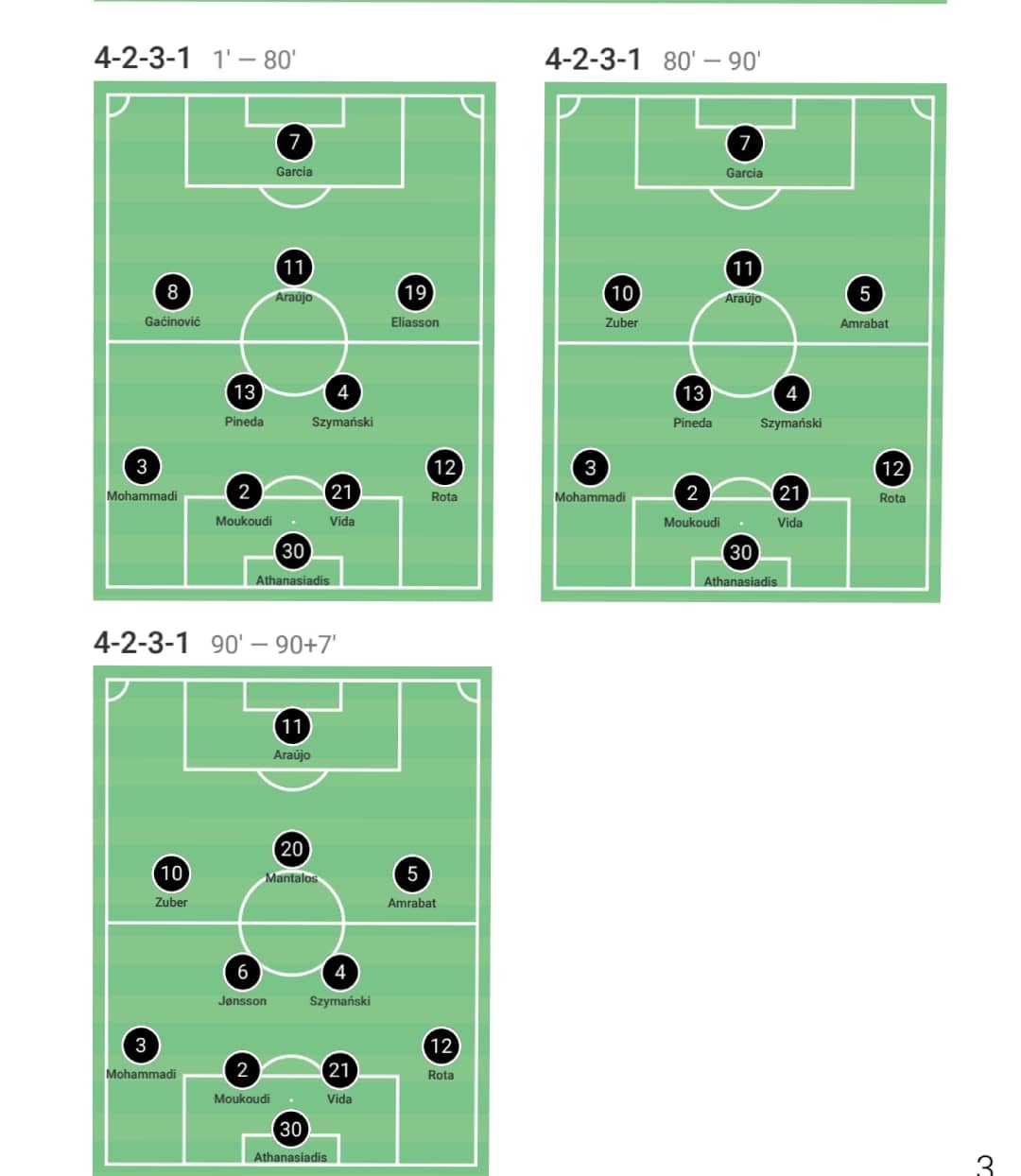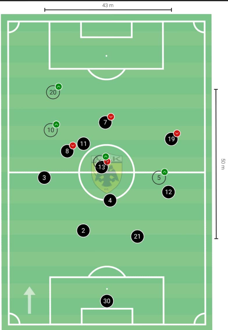 Σε σύγκριση με προηγούμενα παιχνίδια βλέπουμε το αμυντικό δίδυμο να κινείται πιό χαμηλά στο γήπεδο και τον Μοχαμάντι για ακόμη μία φορά να ξεκινάει τις ενέργειές του από το μεσαίο τρίτο και σε πολλές περιπτώσεις να γίνεται εξτρέμ.