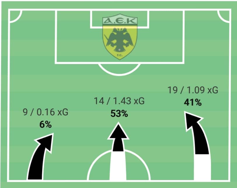 Η ΑΕΚ επιχείρησε αρκετά σουτ μέσα και έξω από την περιοχή όπως βλέπουμε στο παραπάνω γράφημα, επτά τον αριθμό με πέντε διαφορετικούς παίκτες, άλλο ένα σημείο που μας δείχνει τον επιθετικό πλουραλισμό.