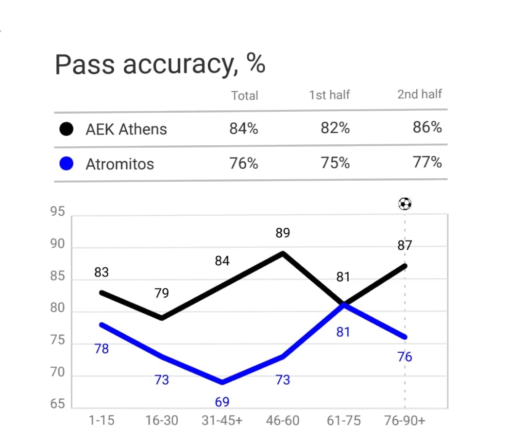 Ειδικά στο τέταρτο από το 46΄- 60΄λεπτό το ποσοστό έφτασε στο 89% όπως επίσης και από το 76 ΄- 90΄+ στο 87%.
